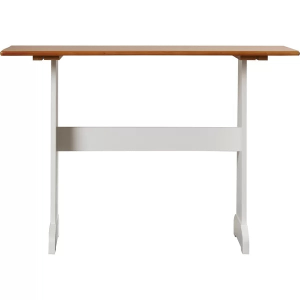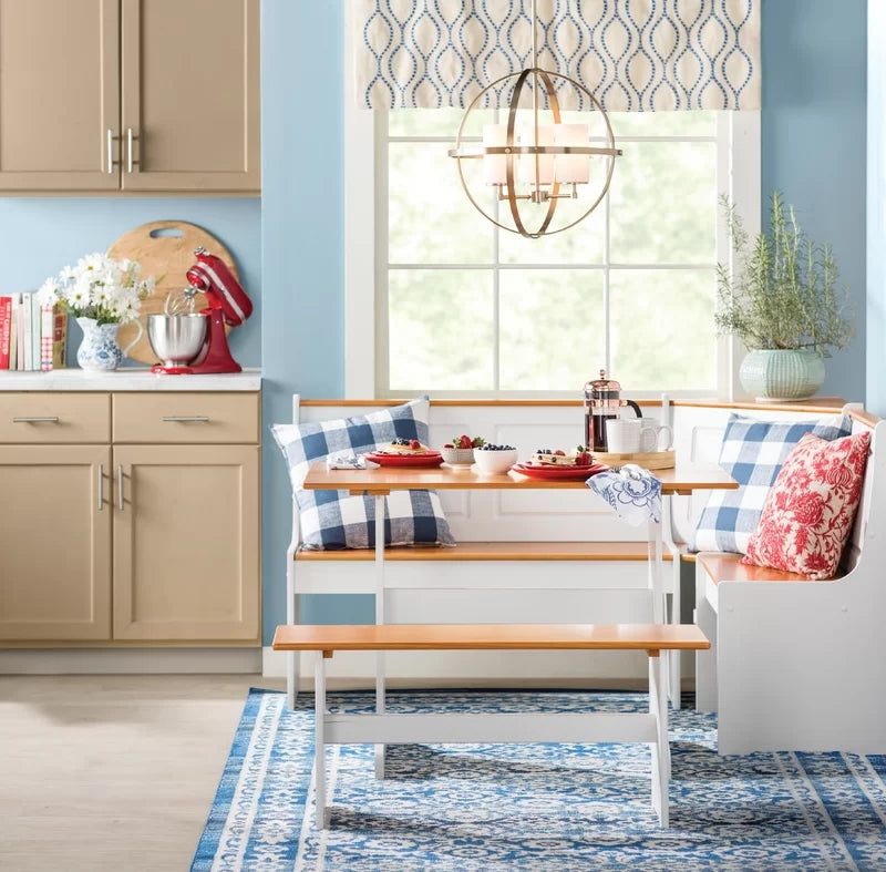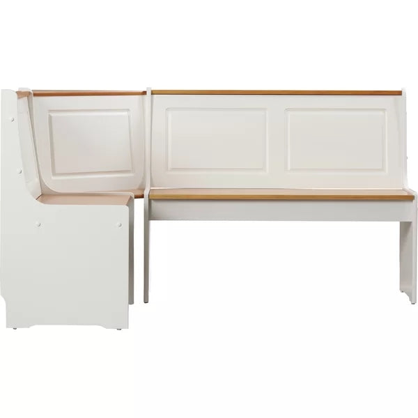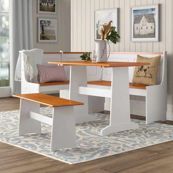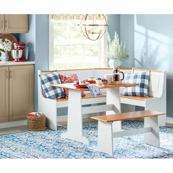 Outfit your eat-in kitchen in classic style with this Birley 3 Piece Solid Wood Breakfast Nook Dining Set, an ideal option for smaller spaces or your first apartment. Their understated design and clean lines allow them to blend in with a variety of color palettes and aesthetics, while their two-toned pecan and white finish complete the look with crisp contrast. Set includes one dining table, one backless bench, and a U-shaped bench complete with hidden storage under the seats.